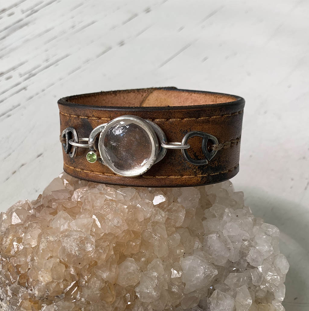 Deze edelsteenschakel met peridoot en bergkristal kun je aan zilveren armband en/of aan de leren band dragen. Heb je die nog niet? Bestel dan een armband inclusief de edelsteenschakel. InnerJewels is een uniek ontwerp, ontworpen om te kunnen combineren en variëren.