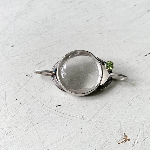 Afmeting bergkristal 20 mm, de facet geslepen peridoot is 4 mm