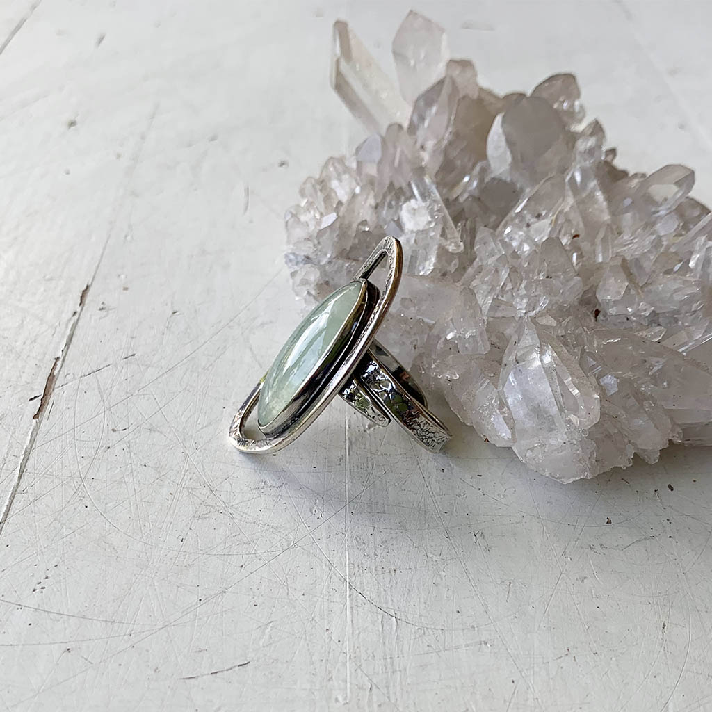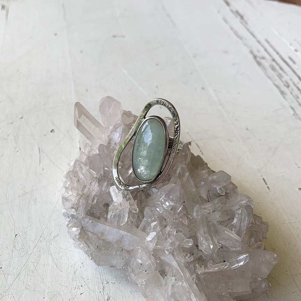 Een royale ring met een prachtige kwaliteit aquamarijn. Natuurlijk past deze ring weer bij alle andere InnerJewels sieraden. Ook deze zilveren schakel om de edelsteen heen heeft de unieke kantprint. De schakel is asymmetrisch gevormd en loopt met de hand mee..