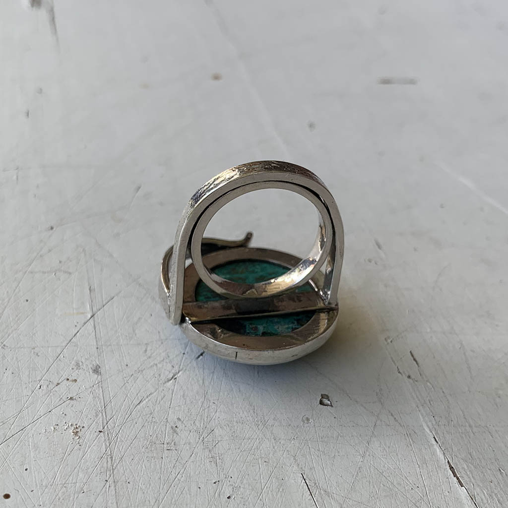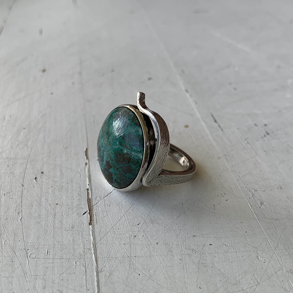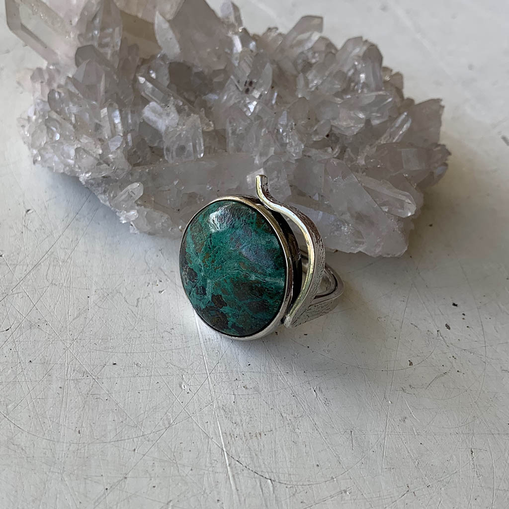 Een ronde ring met een Swing met een unieke chrysocolla. De ring past bij alle andere InnerJewels sieraden. Ook deze ring heeft de unieke kantprint van InnerJewels op de scheen van de ring en in de Swing..